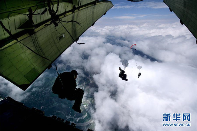 2008年5月14日,15名空降兵從地震災(zāi)區(qū)四川茂縣上空4999米的高空奮不顧身跳下,進入道路阻斷的災(zāi)區(qū)參加救援。新華社發(fā)(劉應(yīng)華 攝)