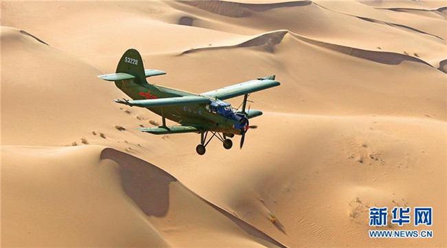 2018年,空軍運-5飛機在沙漠上空進行飛播造林作業(yè)。 新華社發(fā)(席博博 攝)