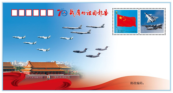 《戰(zhàn)鷹向祖國報告》紀(jì)念封之一。 10月18日,慶祝人民空軍成立70周年航空開放活動迎來首個公眾日,空軍在活動現(xiàn)場發(fā)布一套兩枚強(qiáng)軍主題紀(jì)念封《戰(zhàn)鷹向祖國報告》,展現(xiàn)空軍殲-20、運(yùn)-20、轟-6N等新型戰(zhàn)機(jī)的藍(lán)天英姿。