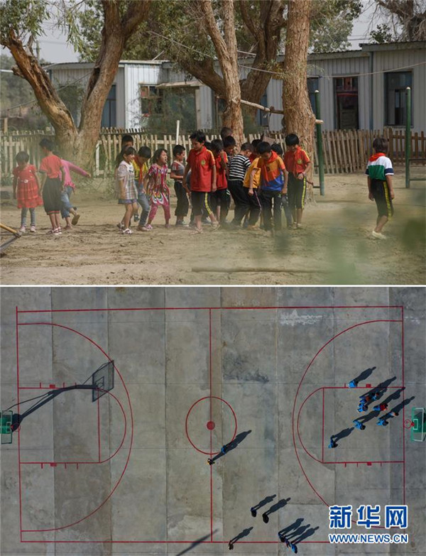 拼版照片:上圖為學(xué)生利用課間時間在平整易地扶貧搬遷前的校園操場(2018年9月6日攝);下圖為學(xué)生們在于田縣達里雅布依鄉(xiāng)易地扶貧搬遷安置點的水泥操場上打籃球(2019年11月19日無人機拍攝)。新華社記者胡虎虎攝