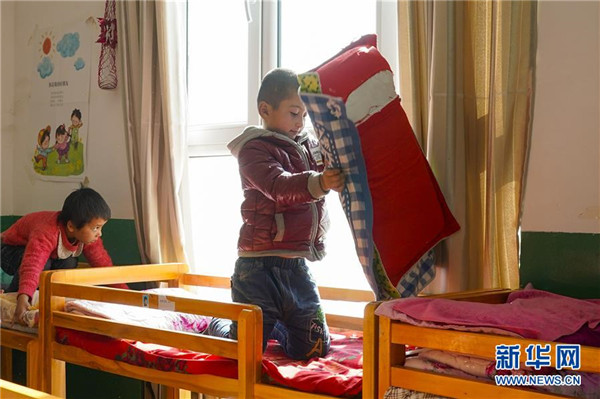 11月19日,在新疆于田縣達里雅布依鄉(xiāng)易地扶貧搬遷安置點的新幼兒園,中班孩子買買提·買和木提(右)整理枕頭被褥準(zhǔn)備睡午覺。在該校位于塔克拉瑪干沙漠腹地的舊址,孩子們平時只能在大通鋪上休息,而在新校舍,每個孩子都有自己的木床睡。新華社記者沈伯韓攝