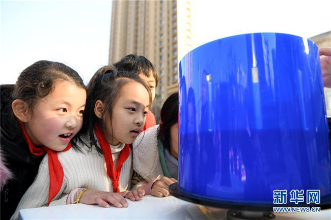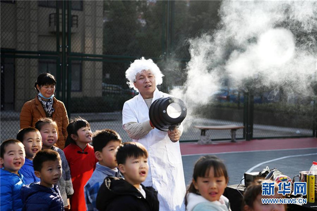 12月4日,科企社區(qū)小朋友在觀看“煙圈炮”小實驗。新華社記者 劉軍喜 攝