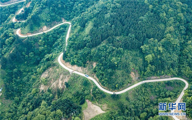 “通村村”車輛行駛在貴州省雷山縣大塘鎮(zhèn)的鄉(xiāng)村公路上(5月24日無(wú)人機(jī)拍攝)。 新華社記者 陶亮 攝