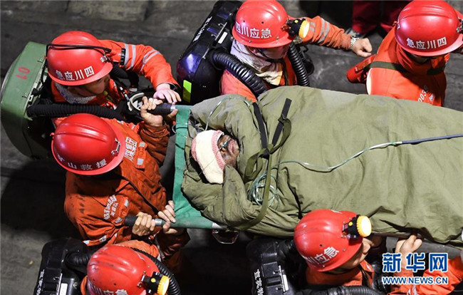 12月18日,救援人員轉(zhuǎn)運(yùn)安全升井的被困人員。 當(dāng)日7時(shí)56分,經(jīng)過80多個(gè)小時(shí)的緊張救援,發(fā)生透水事故的川煤集團(tuán)杉木樹煤礦13名被困人員全部安全升井。 新華社記者 薛玉斌 攝