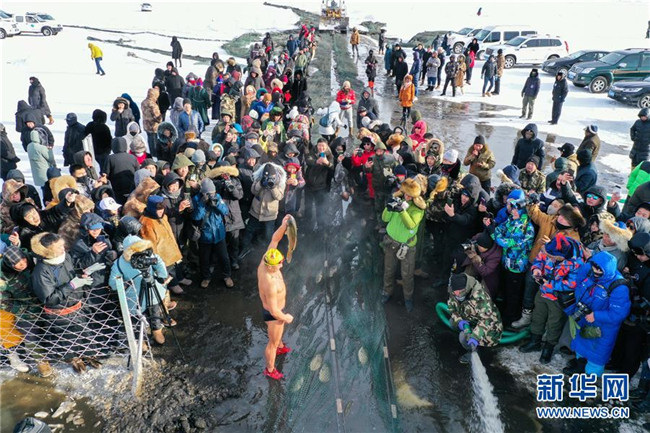 12月18日,一名冬泳愛(ài)好者展示冬捕魚(yú)(無(wú)人機(jī)拍攝)。新華社記者 劉磊 攝