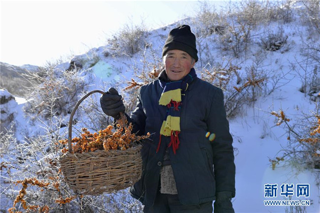 12月18日,當(dāng)?shù)厝罕娫谇逅涌h野生沙棘保護(hù)地采摘沙棘果。  新華社記者 徐欽 攝