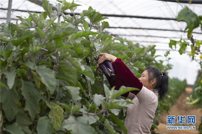 12月18日,在于都縣禾豐鎮(zhèn)一家富硒蔬菜種植基地,農民在采摘富硒茄子。新華社記者 張浩波 攝