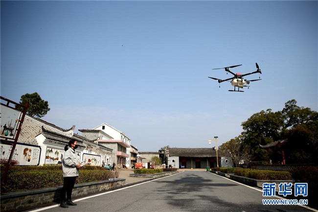 在江西省吉安市峽江縣馬埠鎮(zhèn)上蓋村,農(nóng)機合作社飛手操作無人機進行消殺作業(yè)(2月1日攝)。 新華社發(fā)(陳福平 攝)