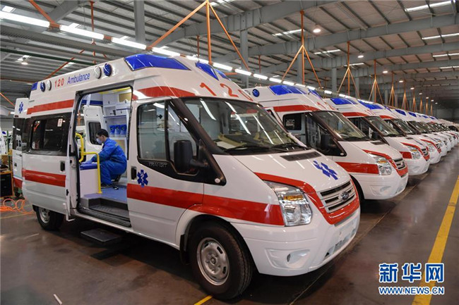 在江西江鈴汽車集團改裝車股份有限公司負壓救護車生產(chǎn)基地內(nèi),工作人員在負壓救護車生產(chǎn)線上進行裝配調(diào)試(2月6日攝)。  新華社記者 彭昭之 攝