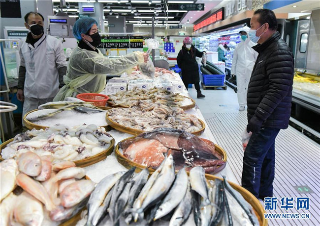 2月10日,顧客在湖北省武漢市江漢區(qū)中百倉儲(chǔ)超市北湖購物廣場(chǎng)店選購水產(chǎn)。新華社記者 李賀 攝