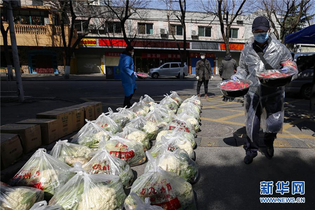 在武漢,下沉花橋社區(qū)的干部在搬運(yùn)居民訂購(gòu)的草莓(2月20日攝)。 新華社記者 沈伯韓 攝
