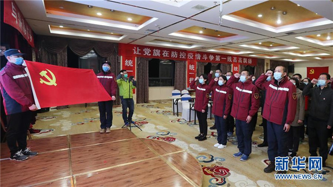 在湖北省咸寧市,云南省援助湖北省醫(yī)療隊(duì)臨時(shí)黨委組織疫情防控一線第一批發(fā)展黨員進(jìn)行入黨宣誓儀式(2月26日攝)。 新華社發(fā)(楊崢 攝)