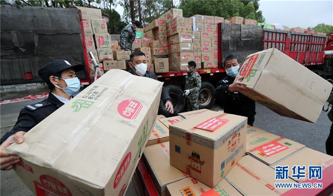 一批云南捐贈(zèng)的食品和醫(yī)療用品等物資運(yùn)抵咸寧市(2月28日攝)。新華社發(fā)(楊崢 攝)