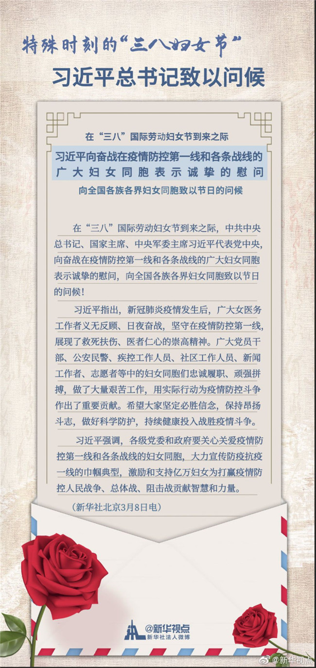 在“三八”國際勞動(dòng)?jì)D女節(jié)到來之際,中共中央總書記、國家主席、中央軍委主席習(xí)近平代表黨中央,向奮戰(zhàn)在疫情防控第一線和各條戰(zhàn)線的廣大婦女同胞表示誠摯的慰問,向全國各族各界婦女同胞致以節(jié)日的問候!