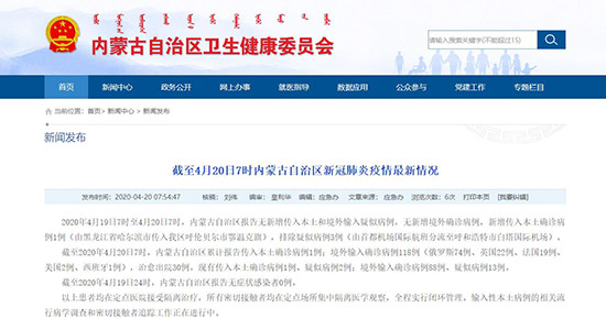 截至2020年4月19日24時(shí),內(nèi)蒙古自治區(qū)報(bào)告無(wú)癥狀感染者0例。