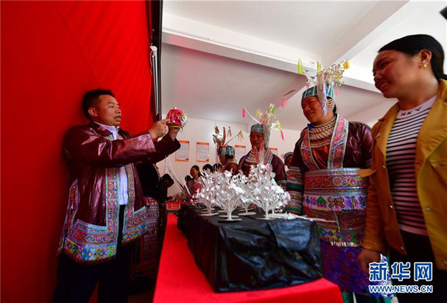 5月12日,在廣西融水苗族自治縣同練瑤族鄉(xiāng)民族廣場(chǎng),侗族群眾在展示侗族頭飾。新華社記者 黃孝邦 攝