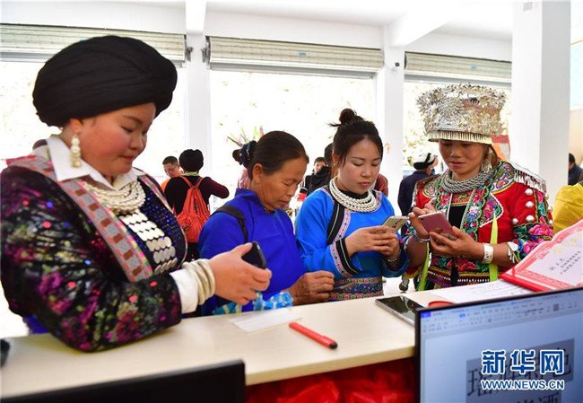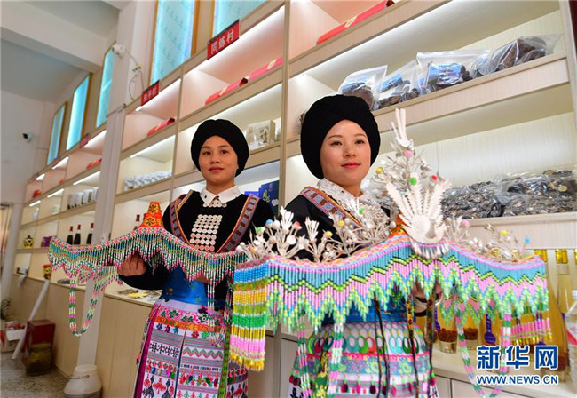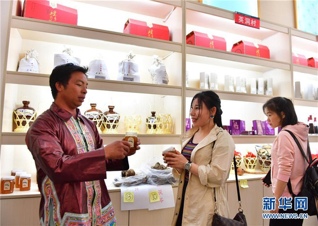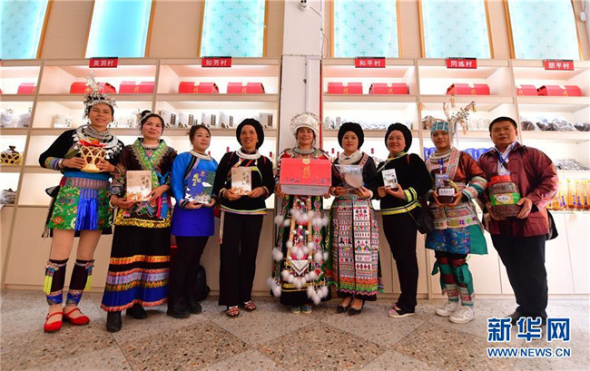 5月12日,在廣西融水苗族自治縣同練瑤族鄉(xiāng)民族廣場(chǎng),少數(shù)民族群眾在展示特色產(chǎn)品。新華社記者 黃孝邦 攝