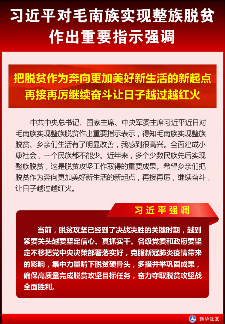 中共中央總書記、國家主席、中央軍委主席習近平近日對毛南族實現(xiàn)整族脫貧作出重要指示表示,得知毛南族實現(xiàn)整族脫貧、鄉(xiāng)親們生活有了明顯改善,我感到很高興。全面建成小康社會,一個民族都不能少。近年來,多個少數(shù)民族先后實現(xiàn)整族脫貧,這是脫貧攻堅工作取得的重要成果。希望鄉(xiāng)親們把脫貧作為奔向更加美好新生活的新起點,再接再厲,繼續(xù)奮斗,讓日子越過越紅火。