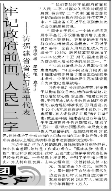 “我們要始終牢記政府前面的‘人民’二字,對群眾的悲歡冷暖感同身受。”2002年3月4日,人民日報兩會特刊的“代表團之聲”欄目里,刊發(fā)了對時任福建省省長的習近平代表的采訪,標題是《牢記政府前面“人民”二字》。
