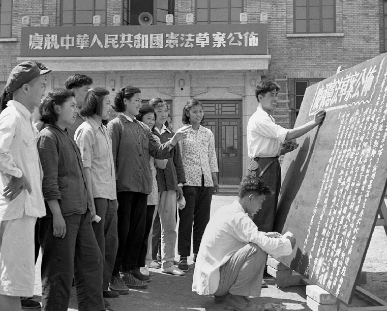1954年6月,北京市各界人民熱烈擁護(hù)《中華人民共和國憲法草案》。圖為北京國營第一棉紡織廠工人們,獲悉《中華人民共和國憲法草案》公布的消息后,立刻出版黑板報宣傳。