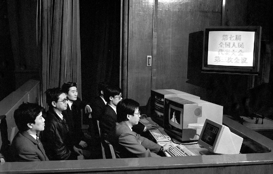 1990年3月,工作人員在七屆全國人大三次會議上監(jiān)視電子表決系統(tǒng)的運(yùn)轉(zhuǎn)情況。這套電子表決系統(tǒng)有報到、表決和即席發(fā)言3種功能。這是首次啟用電子表決器。