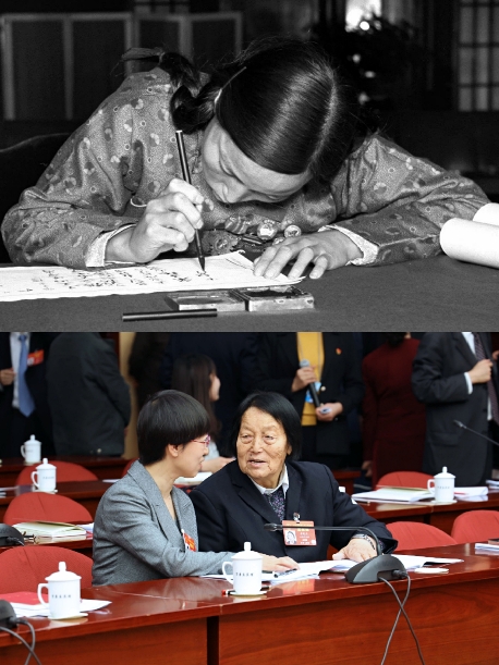申紀(jì)蘭用她半生時間見證了中國民主法制建設(shè)的進(jìn)程。上圖為出席第一屆全國人民代表大會第一次會議的人大代表申紀(jì)蘭在報到(1954年9月攝);下圖為她(右)在十三屆全國人大二次會議山西代表團(tuán)會議間隙與青年代表交流(2019年3月攝)。