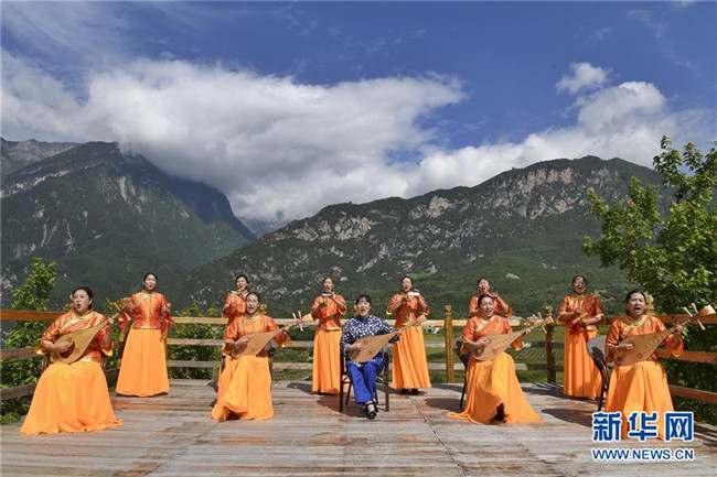 6月19日,四川省阿壩藏族羌族自治州九寨溝縣南坪鎮(zhèn)琵琶彈唱中心的藝人為游客彈唱南坪曲子《采花》。新華社記者 劉坤 攝
