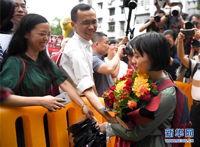 7月8日,一名考生(右)在湖南省長沙市一中考點(diǎn)外從家長手中接過鮮花。 當(dāng)日,全國部分地區(qū)2020年高考結(jié)束。 新華社記者 薛宇舸 攝