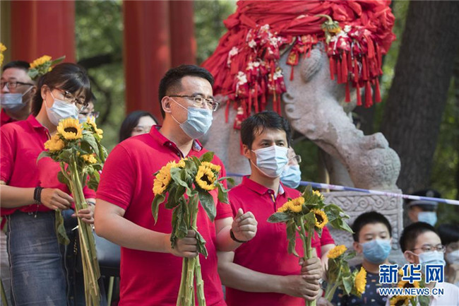 7月8日,在黑龍江省哈爾濱市第三中學(xué)考點(diǎn)外,老師拿著向日葵迎接考生。 當(dāng)日,全國部分地區(qū)2020年高考結(jié)束。 新華社發(fā)(張濤攝)