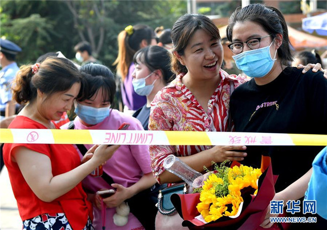 7月8日,吉林省長春希望高中考點(diǎn)的考生接過家長手中的花束。 當(dāng)日,全國部分地區(qū)2020年高考結(jié)束。 新華社記者 張楠 攝