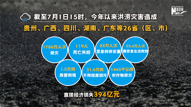 今年汛情帶來(lái)的破壞力有多強(qiáng)?張家團(tuán)告訴記者,截至7月1日15時(shí),今年以來(lái)洪澇災(zāi)害造成貴州、廣西、四川、湖南、廣東等26省(區(qū)、市)1786萬(wàn)人次受災(zāi),119人死亡失蹤,85萬(wàn)人次緊急轉(zhuǎn)移安置,33.4萬(wàn)人次需緊急生活救助;1.5萬(wàn)間房屋倒塌,21.6萬(wàn)間不同程度損壞;農(nóng)作物受災(zāi)面積1465千公頃,其中絕收150千公頃;直接經(jīng)濟(jì)損失394億元。