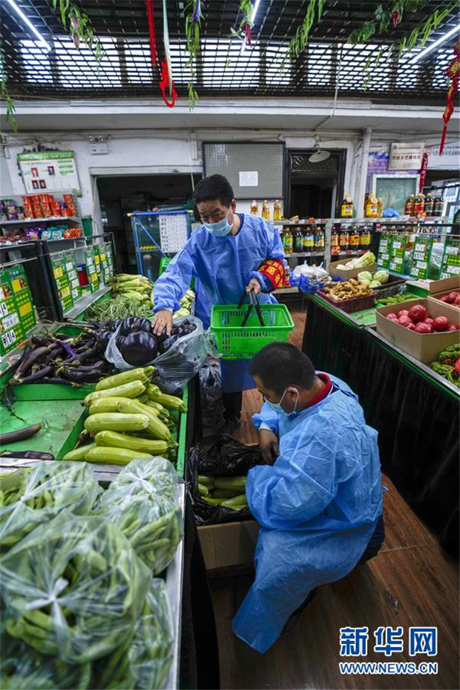 在烏魯木齊市沙依巴克區(qū)揚子江街道青松苑社區(qū)蔬菜直銷點,陳金奇(前)幫助為小區(qū)居民采買的志愿者按照網(wǎng)絡(luò)訂單挑選蔬菜(8月8日攝)。新華社記者 趙戈 攝
