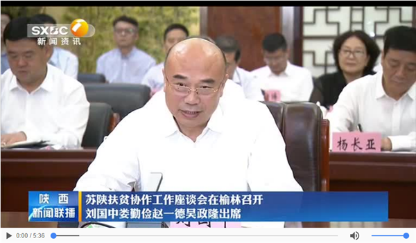 省委書記劉國中主持會議并講話,江蘇省委書記婁勤儉講話。省長趙一德、江蘇省省長吳政隆分別介紹兩省經(jīng)濟社會發(fā)展和蘇陜扶貧協(xié)作情況。省委常委張廣智、王浩、盧建軍,省人大常委會副主任劉小燕、郭青、戴征社,副省長魏增軍、徐啟方,江蘇省委常委張敬華、藍紹敏、郭元強出席會議或參加相關(guān)活動。