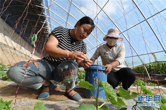 在古浪縣黃花灘生態(tài)移民區(qū)感恩新村,王建林(左)在甜瓜大棚中忙碌(9月1日攝)。 新華社記者 范培珅 攝