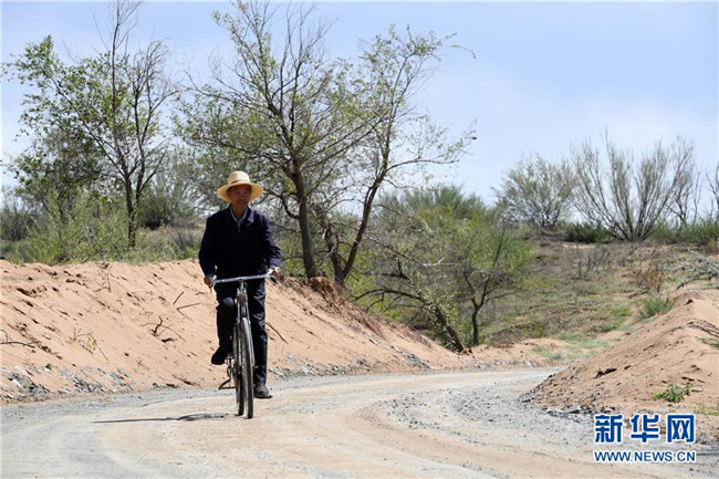 在古浪縣八步沙林場(chǎng),場(chǎng)長(zhǎng)郭萬(wàn)剛騎著自行車巡護(hù)林場(chǎng)(9月1日攝)。 新華社記者 范培珅 攝