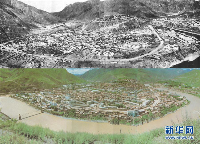 這張拼版照片顯示的是:上世紀(jì)50年代的昌都(上)和上世紀(jì)80年代的昌都景色(資料照片)。新華社發(fā)