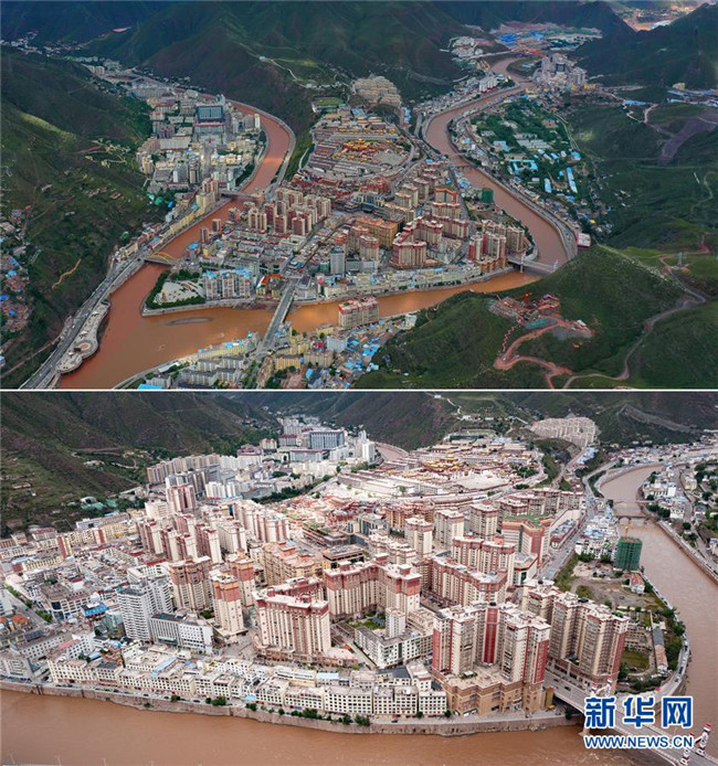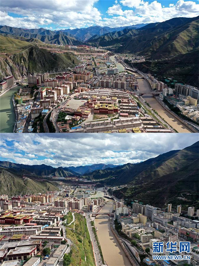 2010年拍攝的昌都市景色(上)和2020年拍攝的昌都市景色(拼版照片)。 新華社記者 普布扎西 攝