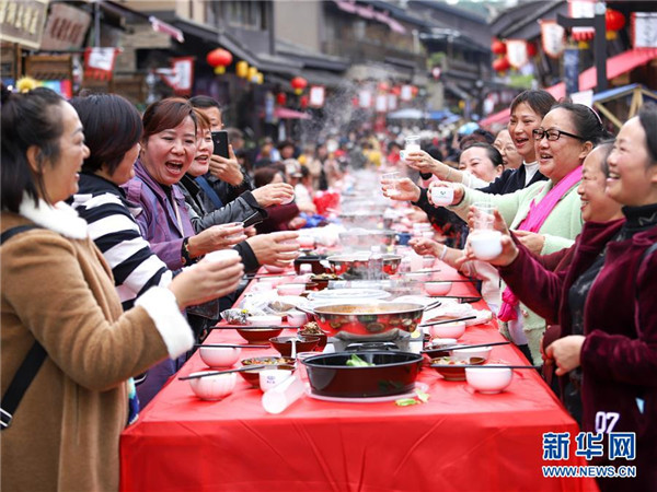 10月18日,游客在貴州省丹寨縣萬(wàn)達(dá)小鎮(zhèn)吃新節(jié)長(zhǎng)桌宴上品嘗佳肴。當(dāng)日,貴州省黔東南苗族侗族自治州丹寨縣萬(wàn)達(dá)小鎮(zhèn)舉辦苗族吃新節(jié)體驗(yàn)活動(dòng)。當(dāng)?shù)孛缱逋J笙舞、品長(zhǎng)桌宴,并邀請(qǐng)游客參與其中,大家在歡聲笑語(yǔ)中樂(lè)享金秋。新華社發(fā)(陸德華攝)