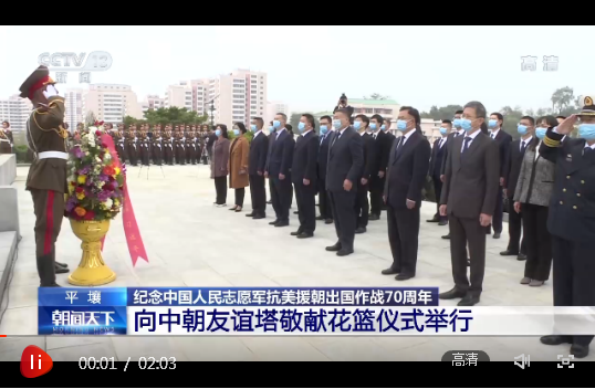 當?shù)貢r間21日,以中共中央總書記、國家主席、中央軍委主席習近平名義向朝鮮平壤中朝友誼塔、檜倉中國人民志愿軍烈士陵園敬獻花籃儀式在朝鮮舉行。中國駐朝鮮大使率全體館員及其他在朝中方人員代表出席。