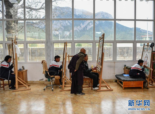 嘎瑪?shù)吕绽先嗽谖鞑夭际锌ㄈ魠^(qū)嘎瑪鄉(xiāng)的民族手工藝培訓(xùn)基地里教學(xué)員們畫唐卡(10月3日攝)。新華社記者 晉美多吉 攝