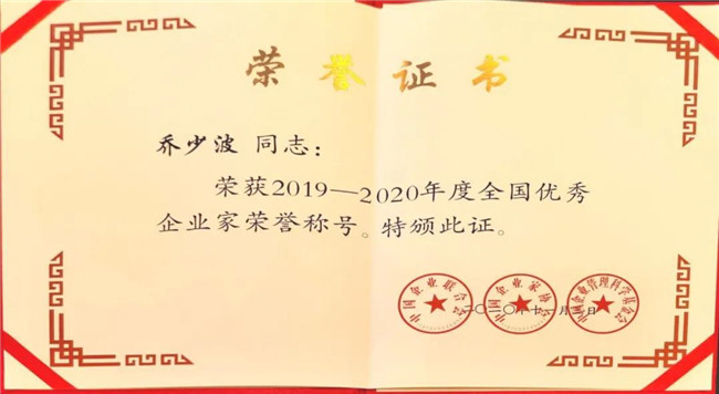 喜訊!神南產(chǎn)業(yè)發(fā)展公司董事長(zhǎng)、總經(jīng)理喬少波喜獲2019-2020年度“全國(guó)優(yōu)秀企業(yè)家”榮譽(yù)稱號(hào)