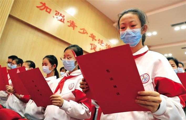 11月30日,陜西省2020年“憲法宣傳周”啟動儀式在西安舉行。全省13個市(區(qū))107個縣(區(qū))統(tǒng)一啟動實(shí)施。這是西安高新區(qū)第五小學(xué)探花嶺校區(qū)學(xué)生正在誦讀憲法。 記者 安濤 攝
