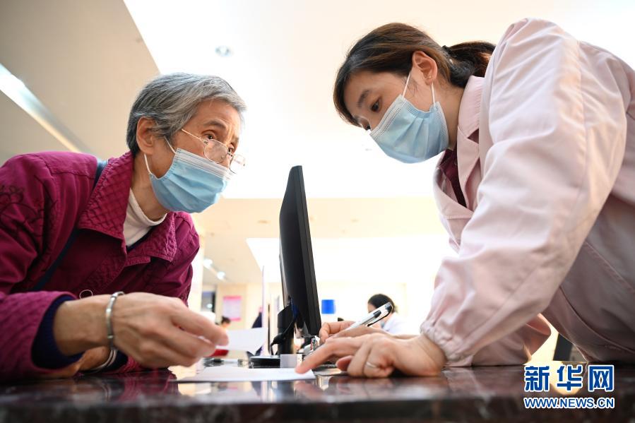 福建省三明市第一醫(yī)院的醫(yī)保辦工作人員(右)向前來咨詢藥品報(bào)銷問題的居民講解相關(guān)政策(11月18日攝)。新華社記者 姜克紅 攝