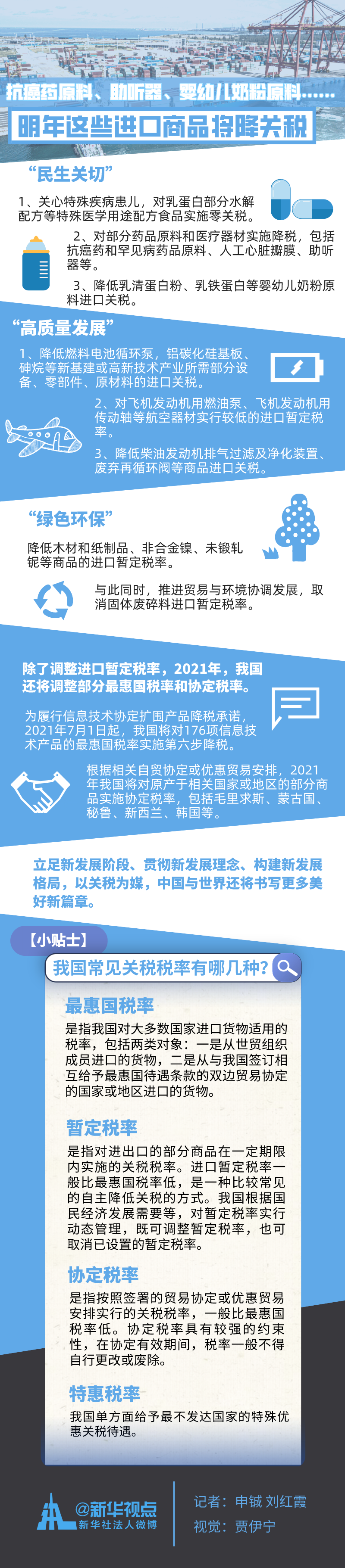 每逢年末,我國(guó)都會(huì)根據(jù)經(jīng)濟(jì)社會(huì)發(fā)展情況對(duì)新一年的部分商品的關(guān)稅稅率進(jìn)行調(diào)整。國(guó)務(wù)院關(guān)稅稅則委員會(huì)23日印發(fā)2021年關(guān)稅調(diào)整方案,決定從明年1月1日開(kāi)始,對(duì)883項(xiàng)商品實(shí)施低于最惠國(guó)稅率的進(jìn)口暫定稅率,抗癌藥原料、助聽(tīng)器、嬰幼兒奶粉原料等跟百姓生活密切相關(guān)的商品均在其中。同時(shí),隨著中國(guó)對(duì)外開(kāi)放持續(xù)擴(kuò)大,部分協(xié)定稅率、最惠國(guó)稅率也將在明年降低。(記者申鋮、劉紅霞)