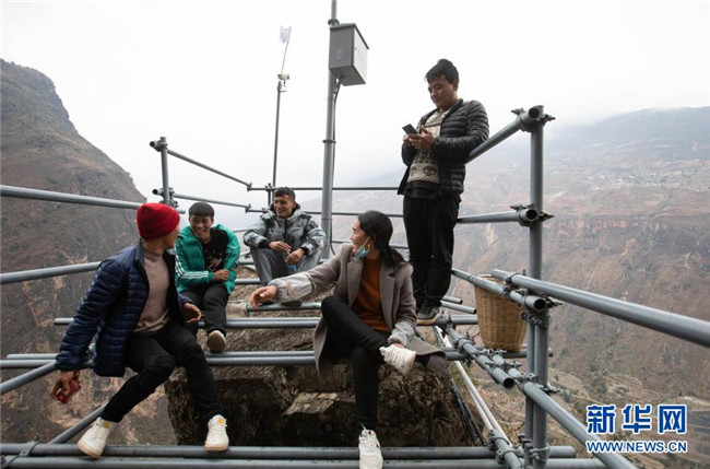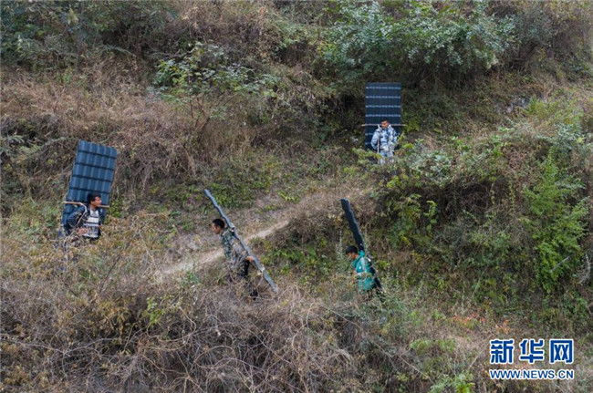 12月23日,某色蘇不惹(中)和同伴在鋼梯上休息,他們正通過鋼梯把修民宿的建材往村里背。新華社記者 江宏景 攝