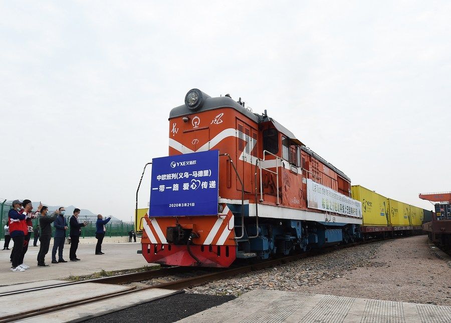 2020年3月21日,載著捐贈(zèng)西班牙抗疫物資的“義新歐”中歐班列(義烏—馬德里)從義烏鐵路西站發(fā)車,前往馬德里。 新華社發(fā)(龔獻(xiàn)明 攝)