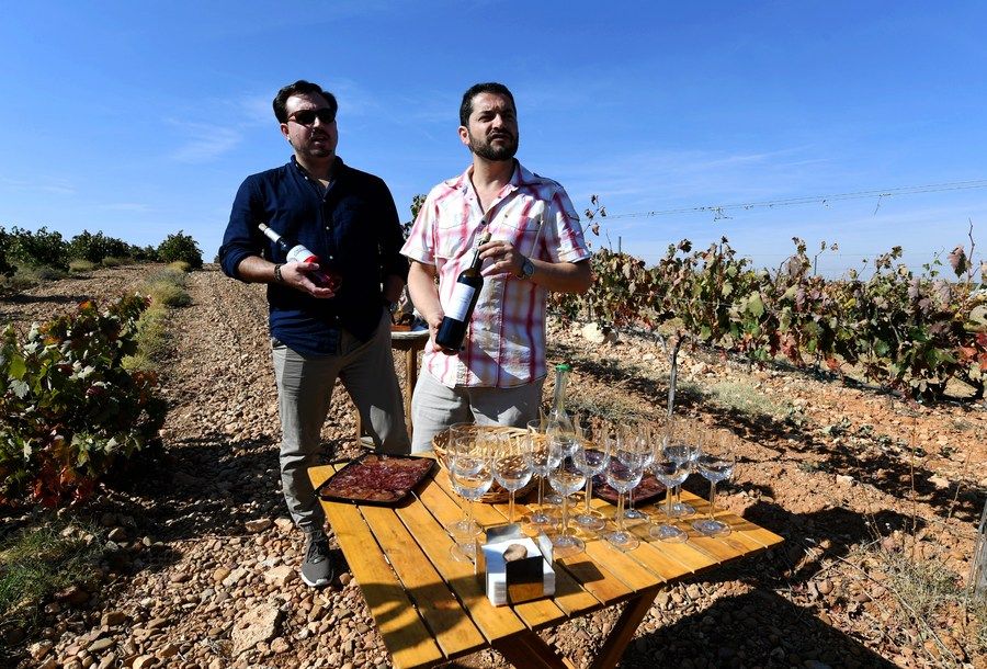 2017年9月24日,在西班牙葡萄酒產(chǎn)區(qū)巴亞多利德市的一處葡萄園內(nèi),兩名村民在展示當(dāng)?shù)蒯劸频钠咸?。這里的葡萄酒有一部分會(huì)通過“義新歐”班列出口到中國(guó)。新華社發(fā) (郭求達(dá) 攝)