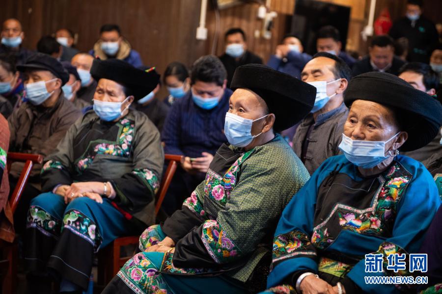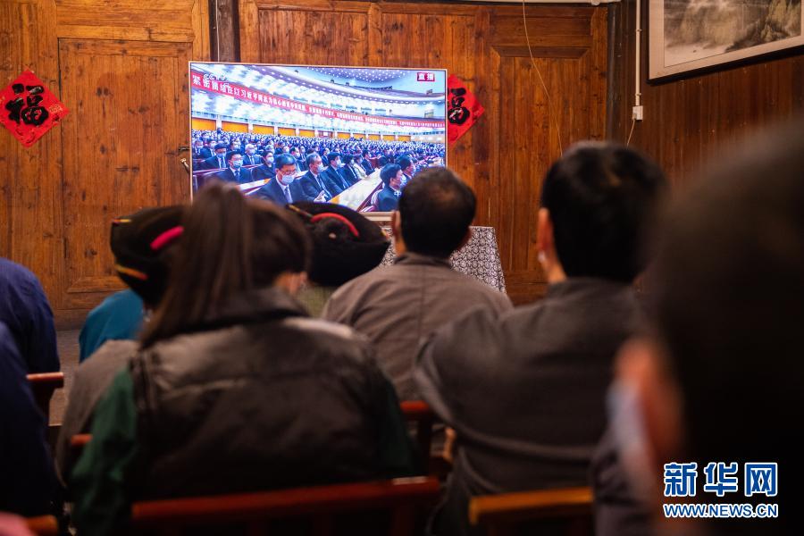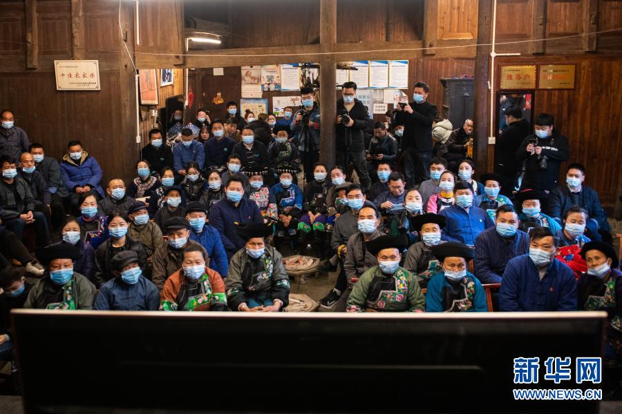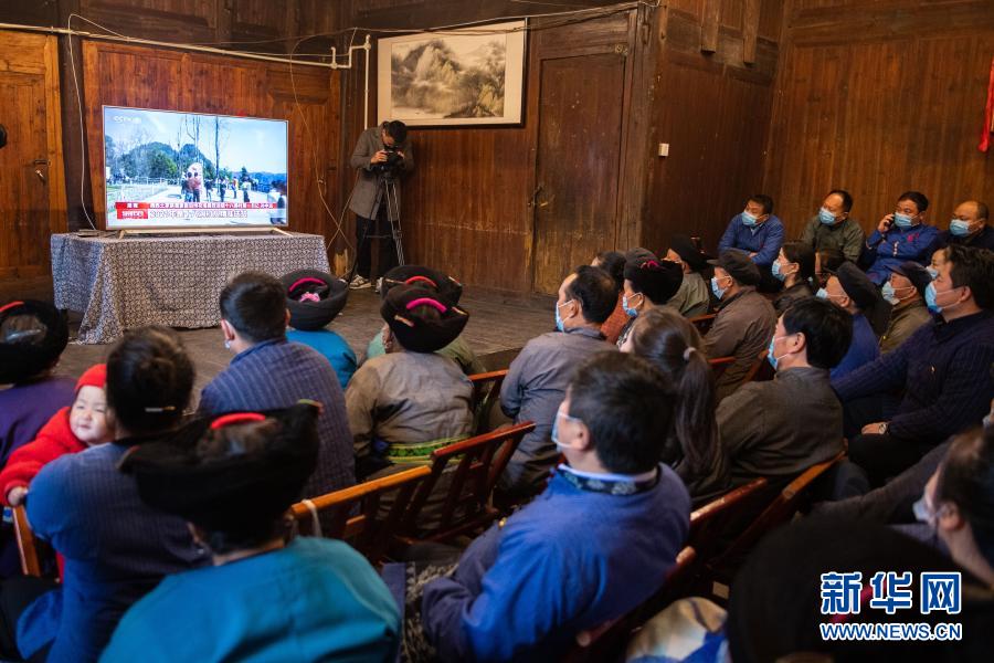 2月25日上午,在湖南省湘西土家族苗族自治州花垣縣十八洞村,當(dāng)?shù)馗刹俊⑷罕娫谝粦舸迕窦沂湛慈珖撠毠?jiān)總結(jié)表彰大會直播。新華社記者 陳思汗 攝