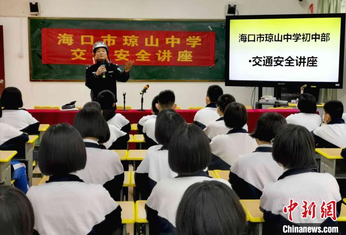 海口公安交警進校園開展“交通安全第一課”活動。??诮痪﹫D