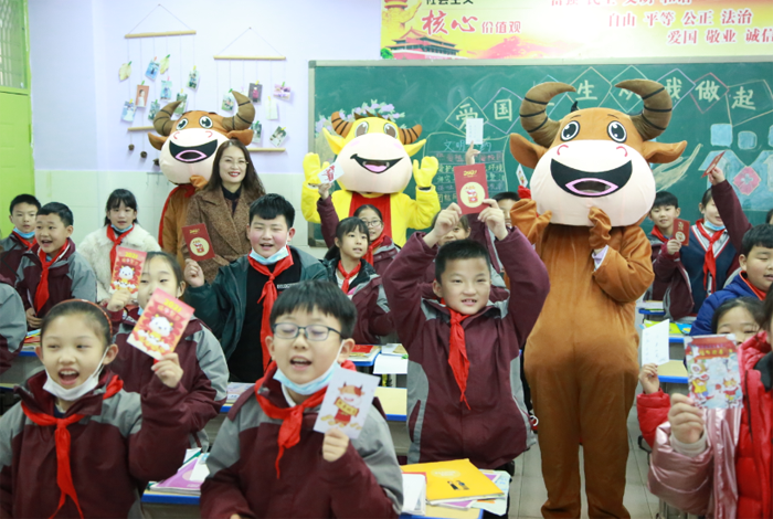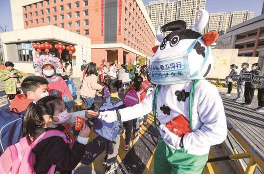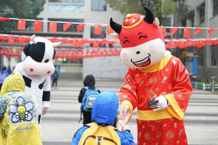 2月21日,南京市江寧開發(fā)區(qū)學校一老師打扮成“福氣牛”,在校園門口為孩子們送上裝有口罩、新年祝福和防疫小貼士的“紅包”。邵丹 攝
